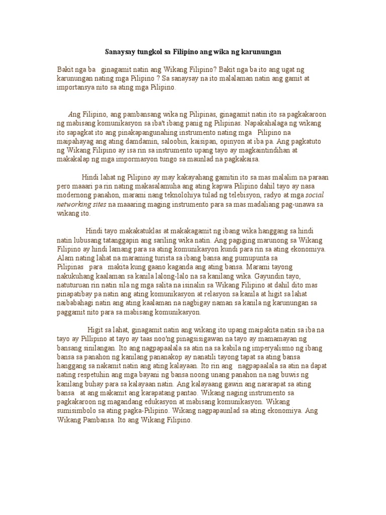 Sanaysay tungkol sa Filipino ang wika ng karunungan B. Wika ang tanging kasangkapan ng tao sa pakikipag-ugnayan niya sa kapwasa asosasyon sa institusyon at maging sa dakilang Bathala. Sa pagkakaalam natin.