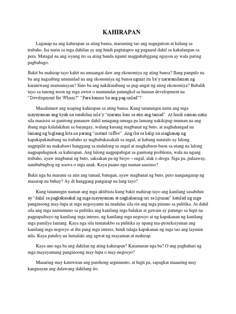 Pagtago ng pera ng ilan at hindi pinaiikot. Michael Xian Lindo Marcelino. Dahil dito kinalap namin at pinagsama-sama ang ilang mga halimbawa ng sanaysay tungkol sa kahirapan.